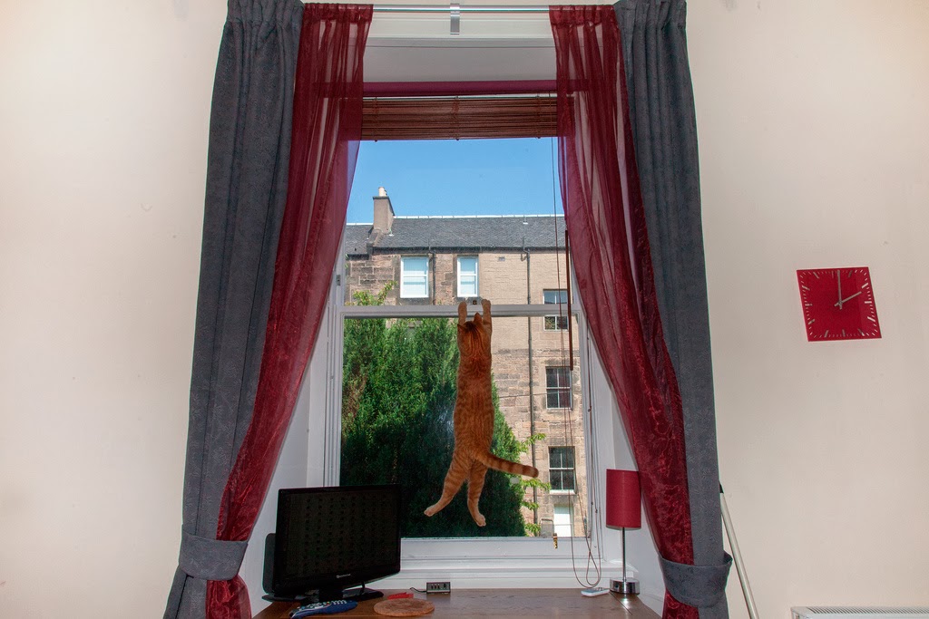 If I remember correctly it was a Saturday or a Sunday morning and finally Scotland seemed to be able to enjoy a real summer. It was warm, the sun was out and I had a few windows open at the front of my flat. Trevor began to run back and forwards like a fool, jumping in the air and off of furniture. Well, writing this I may sound as if I was surprised at this sudden outburst but it's quite a regular scenario in the Ercolano household. He began trying to jump on the second half of the window frame but with little space to stand on he kept falling. This is when I knew he was going to do one of his Trevor shows and I prepared my camera. I have taken many photos of him doing ridiculous stuff mainly hanging or jumping off of things; he is quite the character and a super entertainer...in a very cat kind of way...